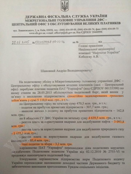 Згідно з листом, станом на 28 травня податковий борг, який виник у зв'язку з несплатою підприємством самостійно задекларованих грошових зобов'язань у сумі 5 млрд 110 млн гривень, однак керівництво "Укрнафти" перешкоджає діям податківців і продовжує накопичувати борг.