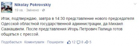 Пізніше прес-секретар Одеської ОДА Микола Покровський заявив, що представлення Саакашвілі відбудеться у суботу о 14:30.