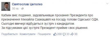 Водночас прес-секретар президента Святослав Цеголко заявляє, що рішення про призначення Саакашвілі на посаду Петро Порошенко має ухвалити лише після зустрічі з кандидатом у п'ятницю ввечері.