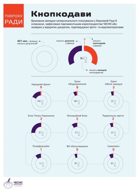 "Якщо лідерство екс-регіонала Віталія Хомутинніка, який встиг прокнопкодавити 5 разів, не дивує, то кількість кнопкодавів серед "постмайданівської" фракції "Народний фронт" відверто засмучує. У лавах "Народного фронту" за півроку роботи зафіксовано 9 кнопкодавів", - йдеться у заяві "Чесно".