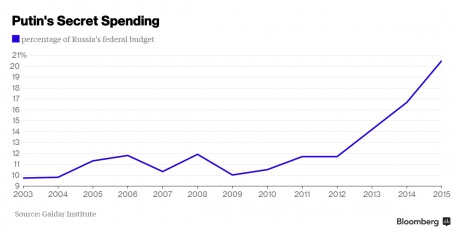 Агентство також приводить дані московського Інституту Гайдара про те, що так звана "чорна" частина бюджету (схвалена, але не розписана), з 2010 року подвоїлася до 21% і зараз становить 3,2 трильйона рублів ($60 мільярдів доларів).