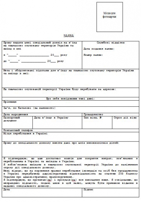 | Заява на отримання спеціального дозволу на в'їзд до Криму й виїзд із нього |