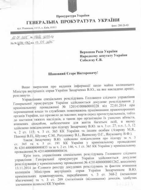 З документу відомо, що щодо екс-міністра Захарченка порушено 4 кримінальні провадження, у трьох з них Захарченку уже оголошено про підозру.