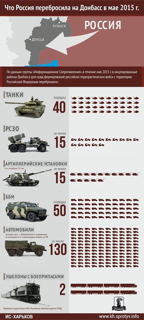 | За травень Росія перекинула бойовикам близько 40 танків, 50 бойових бронемашин, 15 РСЗО тощо |