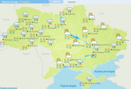 15 червня у західній частині та місцями у північних областях дощі, грози, в окремих районах град та шквали 15-20 м/с, на решті території без опадів. Вітер південно-західний з переходом на північний, 5-10 м/с.