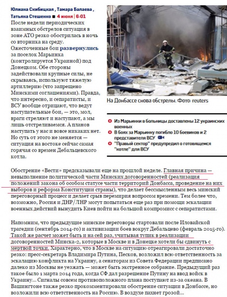 Як відомо, часто в політичних матеріалах видання публікує швидше позицію Кремля. Наприклад, в одному з матеріалів про бої під Мар'їнкою, видання повністю повторювало позицію Кремля і бойовиків: про першочергове виконання політичної частини угод: змінити Конституцію, ввести в дію закони "про особливий статус Донбасу", який передбачає фінансування окупованих територій Україною, на чому наполягає Москва. При цьому видання стверджувало, що "з мертвої точки" Мінські домовленості хотіли зрушити Москва і Донецьк.