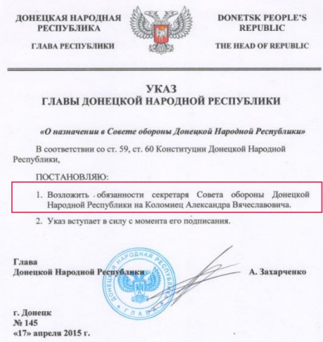 Більше того, раніше людина, яка має такі саме ім'я, прізвище та по-батькові, як новоспечений "перебіжчик", була працевлаштована Захарченком ще у квітні 2015 року. Згідно з указом, він був призначений секретарем Ради оборони утворення "ДНР".