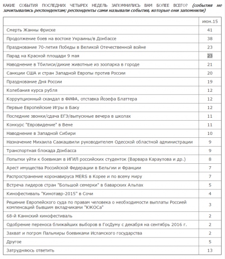 Так, 41% росіян назвав подією, що вразила, смерть співачки Жанни Фріске. 38% - продовження боїв на сході України, ще 23% святкування 70-річчя Перемоги у Великій Вітчизняній війні.
