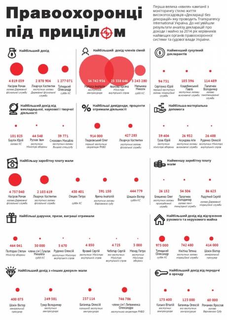 З'ясувалось, що найбільший дохід у 2014 році отримав нинішній голова Фіскальної служби Роман Насіров – 4,9 мільйона гривень. На другому місці – заступник Насірова Костянтин Лікарчук з доходом у майже 2,8 мільйона. Суддя КСУ Олександр Тупицький заробив 1,3 мільйона.