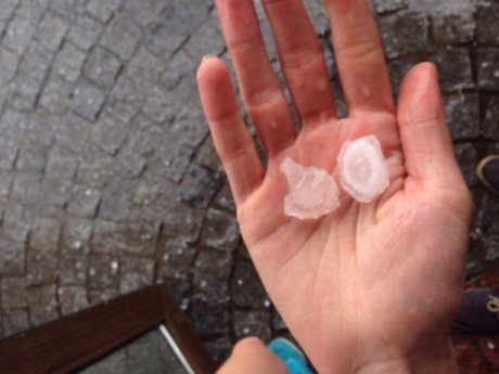 Очевидці повідомляють, що в Харкові випав досить великий град, розміром з перепелине яйце. Сильні дощі і град всюди супроводжуються поривчастим вітром.