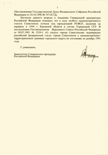 "Ні Конституція РРФСР, ні Конституція СРСР не передбачала повноважень Президії Верховної Ради РРФСР і СРСР з розгляду питань про зміну конституційно-правового статусу автономних радянських соціалістичних республік", - йдеться в документі за підписом заступника генерального прокурора Росії Сабіра Кехлерова.