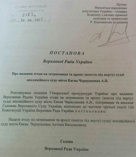 У Верховній раді зареєстровано постанову про надання згоди на затримання і арешт судді апеляційного суду Антона Чернушенка.