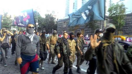 Marsz batalionów ochotniczych i organizacji nacjonalistycznych w Kijowie. Uczestników niezbyt wielu pic.twitter.com/FdLq5tApiQ