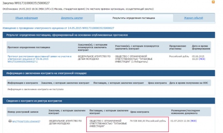 Згідно з результатами тендеру, послуги зі сприяння у проведенні Всеросійського молодіжного форуму "Таврида", в частині забезпечення харчування проживання учасників, експертів і гостей надає ТОВ "Титанові інвестиції". Сума тендеру 74 538 660 рублів (близько 1 316 760 доларів). Тендер проводився лише з одним учасников.