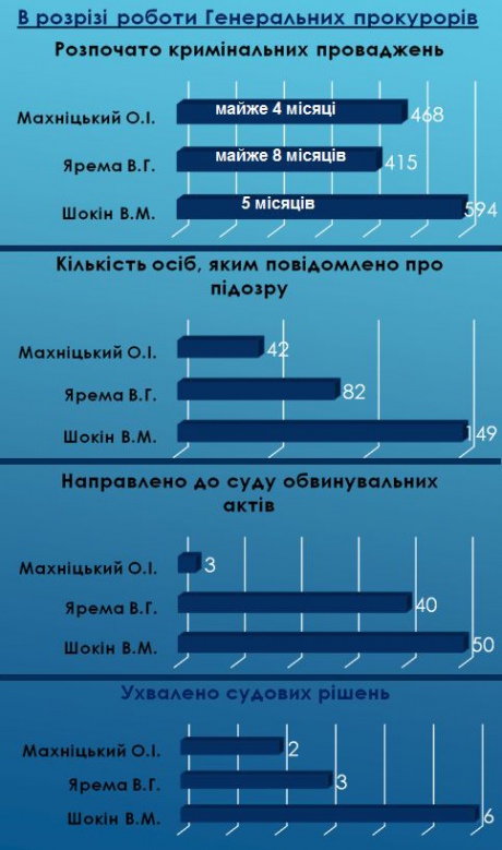 За час перебування Віктора Шокіна на посаді генпрокурора 15 високопосадовцям повідомлено про підозру у причетності до злочинів проти активістів Майдану, а 9-м – щодо розкрадання державних коштів і майна.