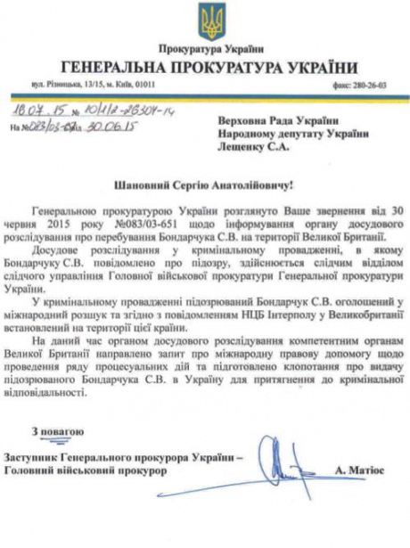 Генпрокуратура звернулась до компетентних органів Великої Британії з клопотанням про видачу Бондарчука.