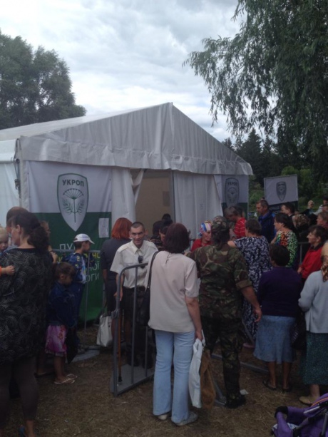За словами кореспондента, близько 15:30 почали отримувати свої пайки люди, які стояли у черзі з 6 години ранку. Охорону палаток забезпечують люди спортивної зовнішності.
