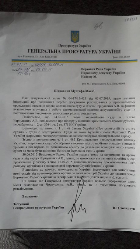 "30.06.2015 року Верховною радою надано згоду на затримання та арешт (взяття під варту) Чернушенка А. В., однак до цього часу він залишив постійне місце проживання", - вказано в листі.