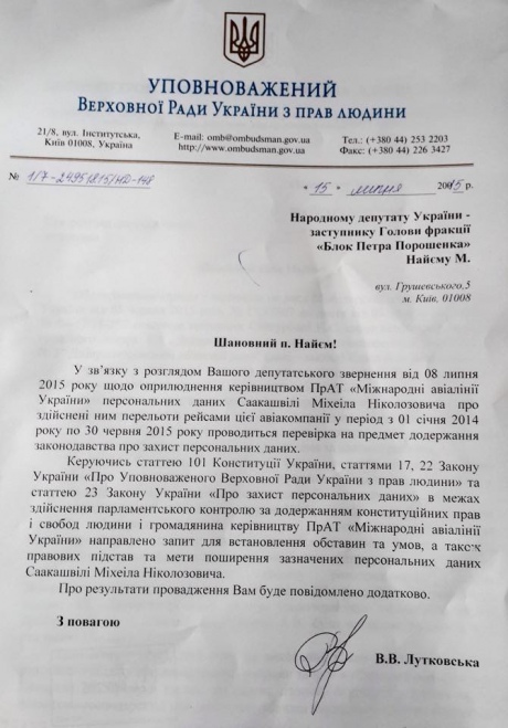 Лутковська повідомила Найему, що керівництву МАУ спрямовано запит щодо правових підстав і мети поширення інформації про польоти Саакашвілі.