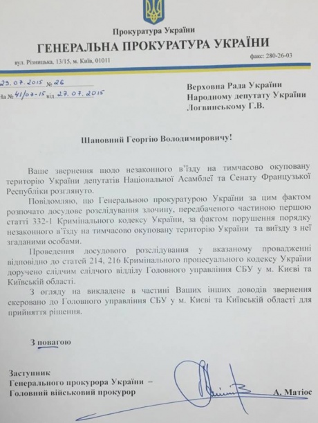 Генеральна прокуратура розпочала досудове розслідування за фактом незаконного в'їзду на окупований Крим деяких французьких депутатів.