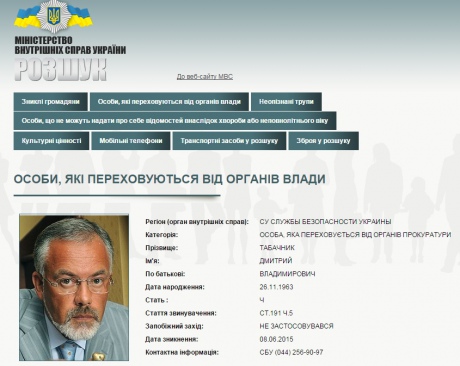 Як вказано в профайлі, Табачника шукають на прохання СБУ, а інкримінують йому розкрадання державного майна в особливо великих розмірах (ч. 5 ст. 191 ККУ).