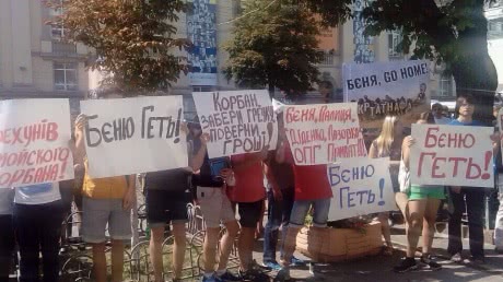 Люди стоять із плакатами "Бєню геть", "Бєня, go home", "Геть брехунів Коломойського і Корбана" та подібними.