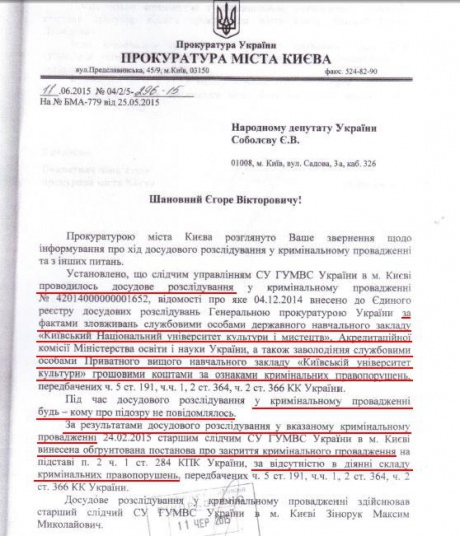 Це випливає з відповіді прокуратури Києва на звернення народного депутата Єгора Соболєва, яку 7 серпня наводить Громадське ТБ.