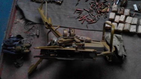 Зі схованки вилучено бойову розвідувально-дозорну машину, два прилади наведення для гаубиць, велику кількість набоїв різних калібрів, дві гранати Ф-1, 12 магазинів до РПК, підставка для АГС, шість приладів наведення до РПГ-7, 67 бронежилетів, 42 кевларові каски, 21 портативну цифрову радіостанцію.