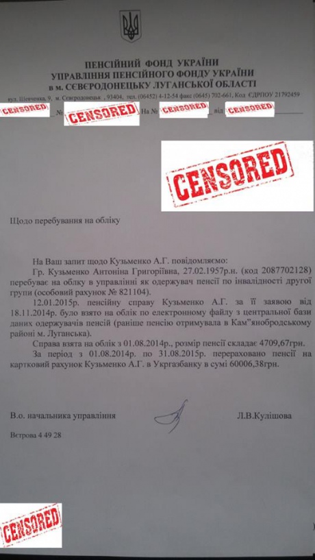 "1 серпня 2014 року Кузьменко оформила собі в Україні пенсію в розмірі 4709,65 грн і донині справно отримує її в Сєвєродонецьку на картку "Укргазбанку", - повідомив він.