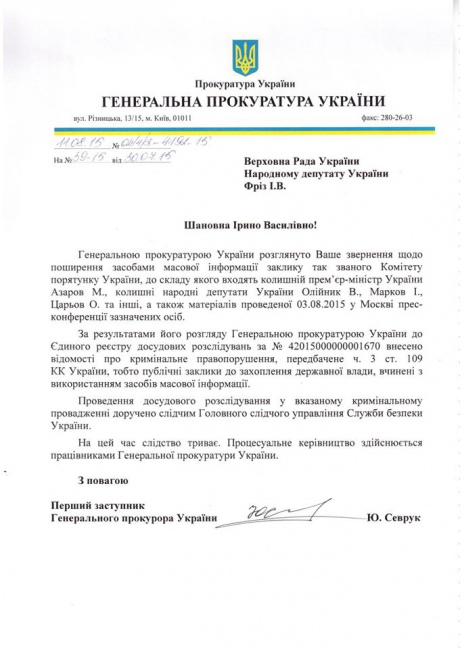 Генеральна прокуратура України порушила кримінальну справу за фактом заяв так "Комітету порятунку України", створеного у Москві екс-главою українського уряду Миколою Азаровим.