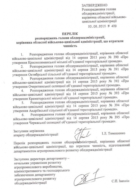 Як відомо, його розпорядженням № 390-395 від 14 серпня були створені Черкаська селищна, Андріївська сільська, Краматорська міська, Очеретинська селищна, Жовтнева сільська, Краснолиманська міська територіальні громади.