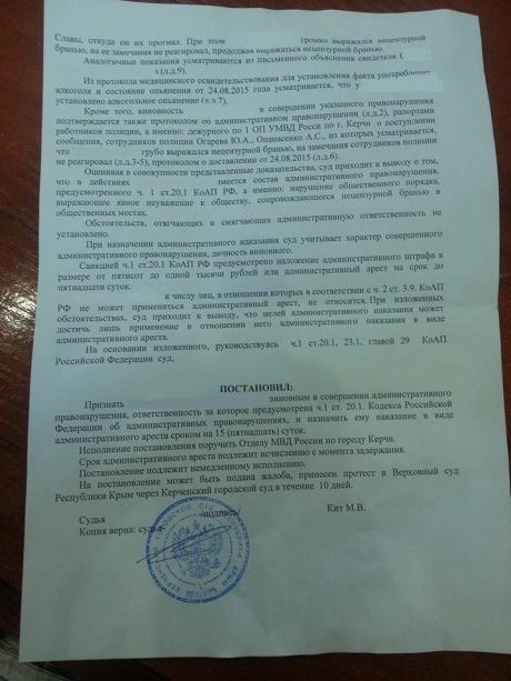 Одному з хлопців присудили 15 діб арешту, іншому – 1000 рублів штрафу.