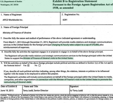 Як свідчать звіти АРСО до Мінюсту США, їхній вашингтонський офіс уклав угоду на просування уряду України у червні цього року.