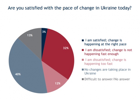 При цьому 40% українців заявили, що жодних змін не відбувається, 32% висловили невдоволення темпом реформ, 13% вагалися із відповіддю, а 12% заявили, що незадоволені занадто швидким темпом реформ.