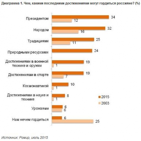 По чверті опитаних пишаються російськими традиціями (25%) і природними ресурсами РФ (24%), хоча останнім не пишалися 12 років тому. По 19% росіян пишаються досягненнями у спорті й досягненнями у військовій техніці й зброї.