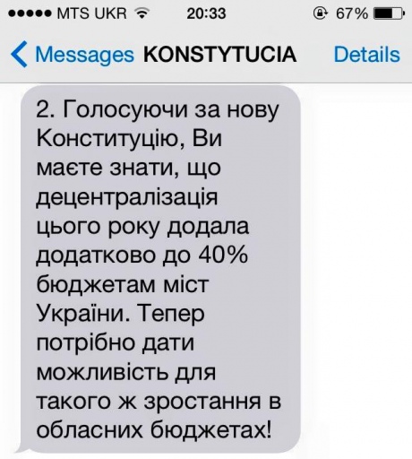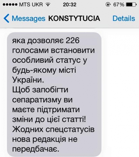 Депутатська розсилка з темою повідомлення "Конституція" містить три пункти, в яких зазначено, що голосування "за" зміни дозволить "зберегти цілісність і єдність держави та запобігти сепаратизму". Також підкреслюється, що жодних спецстатусів нова редакція Конституції не передбачає.