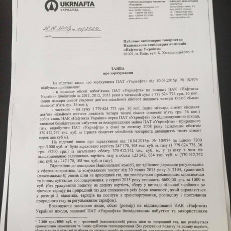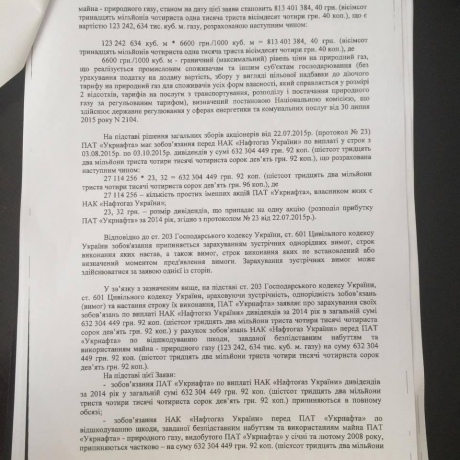 "Укрнафта "заявляє про зарахування своїх зобов'язань щодо сплати "Нафтогазу" дивідендів за 2014 в загальній сумі 632,304 млн гривень в рахунок зобов'язань НАКу перед "Укрнафтою" з відшкодування шкоди, заподіяної безпідставним використанням майна - природного газу в обсязі 123 242,634 тисяч куб. м на суму 632 304,449 тисяч гривень", - йдеться в листі.