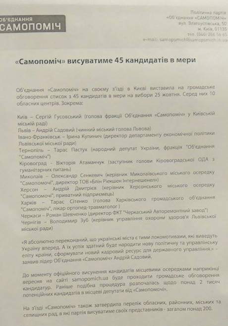 Партія "Самопоміч "затвердила 47 кандидатів, яких вона висуне на посаду мерів на місцевих виборах 25 жовтня.