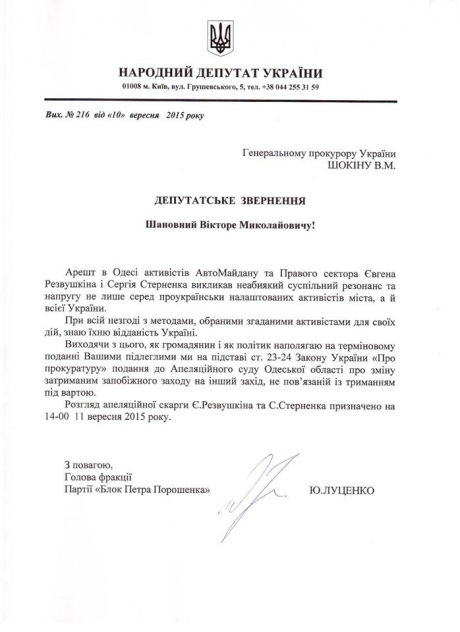 Лідер фракції "Блок Петра Порошенка" Юрій Луценко просить генпрокурора Віктора Шокіна подати апеляцію щодо зміни запобіжного заходу активістам одеського Автомайдану і "Правого сектора".