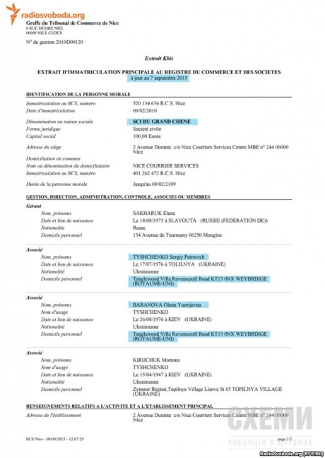 Цей же документ показує, що Олена Тищенко (у дівоцтві – Баранова) та Сергій Тищенко мають спільну адресу реєстрації у Великій Британії. Вілла вартістю 5 мільйонів 400 тисяч фунтів стерлінгів розташована в районі Вейбрідж.