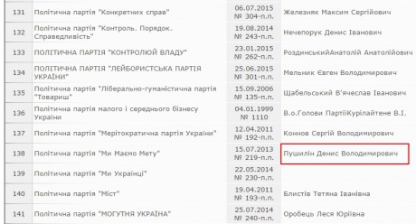 У списку партій, під назвою "Партії, якими прийнято рішення про участь їх місцевих організацій у місцевих виборах" партія Пушиліна записана під номером 138. Її головою вказаний ватажок "ДНР".