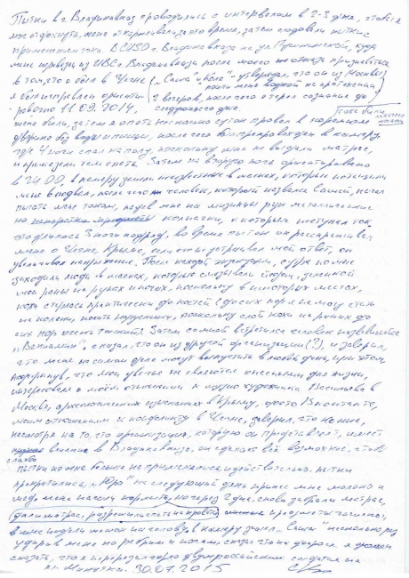 "Після арешту 08.08.2014 до мене були застосовані дії з метою змусити мене дати свідчення, до мене були застосовані незаконні методи дізнання і слідства, виражені в нанесенні мені побоїв у тому числі за допомогою наручників і електричного струму, тривалого стояння на колінах, в результаті чого на зап'ястях рук, колінах, на гомілковостопній частини ніг є численні шрами", - сказано в заяві українця.