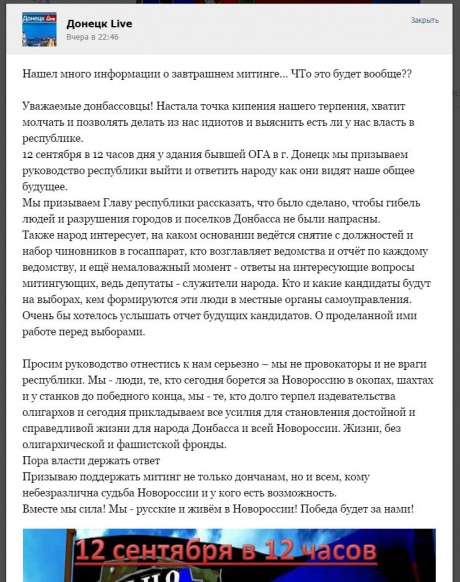 Анонс мітингу в соціальній мережі закликав "керівництво" незаконною "ДНР" розповісти про майбутнє Донецька та інших захоплених територій.