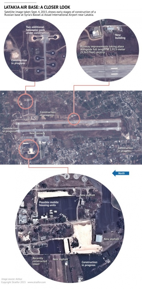 Американська розвідувально-аналітична компанія Stratfor опублікувала знімки з супутника, які є доказом того, що російські військові будують в сирійському аеропорту Латакія свою авіабазу.