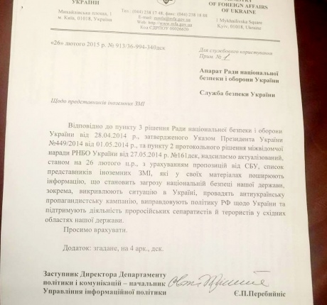У скандальному листі за підписом Євгена Перебийноса (на той час – начальника управління інформполітики) дійсно не згадується слово "санкції". МЗС лише просить РНБО "врахувати" дані про "антиукраїнських" журналістів.