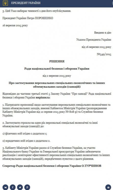 | Указ про запровадження санкцій. Скріншот із сайту РНБО |