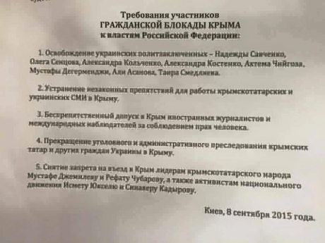 Вони представили документ "Вимоги учасників громадянської блокади Криму до властей РФ", в якому перелічено низку вимог до влади РФ, серед них - звільнення українських політв'язнів Надії Савченко, Олега Сенцова, Олександра Кольченка, Олександра Костенка, Ахтема Чийгоза, Мустафи Дегерменджі, Алі Асанова і Таїра Смедляєва, припинення переслідування кримських татар, вільні умови роботи для українських ЗМІ та іноземних журналістів, а також зняття заборони на в'їзд до Криму лідерам кримськотатарського народу/
