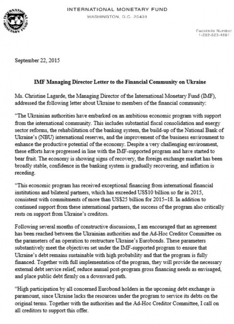 Про це сказано в листі Лагард до фінансового співтовариства.