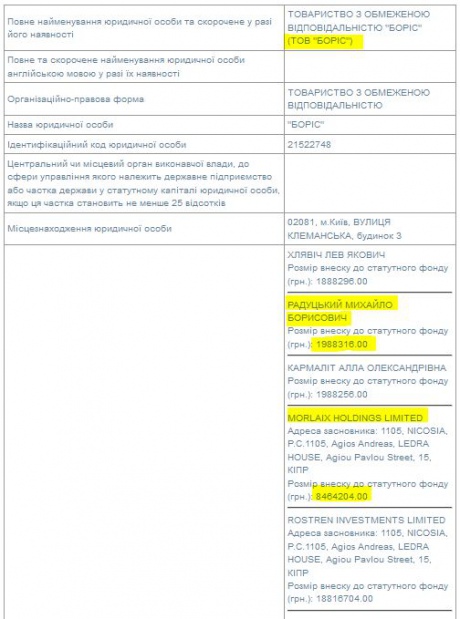 Наразі частка Михайла Радуцького в цьому бізнесі складає 10,45 млн грн, або 12,4%. З них 2% Радуцький володіє безпосередньо, а решту 10% контролює опосередковано через кіпрську компанію"Morlaix Holdings Limited", яка має частку в "Борісі" з 2006 р.