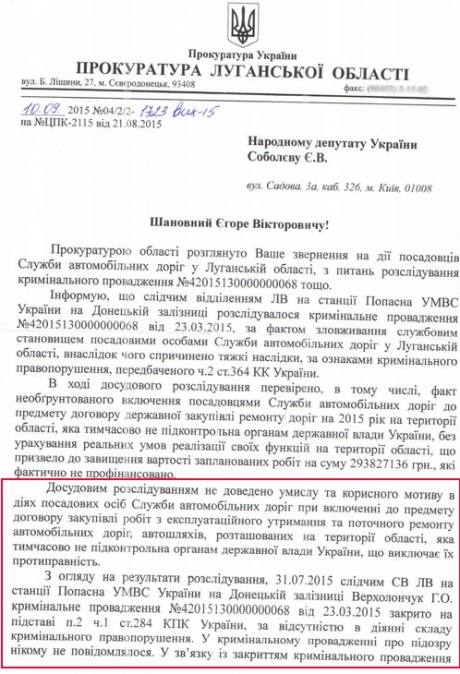 "Досудовим розслідування не доведено умислу та корисного мотиву в діях посадових осіб Служби автомобільних доріг при включення до предмету договору … доріг… розташованих на території області, яка тимчасово не підконтрольна органам державної влади, що виключає їх протиправність", - сказано в повідомленні.